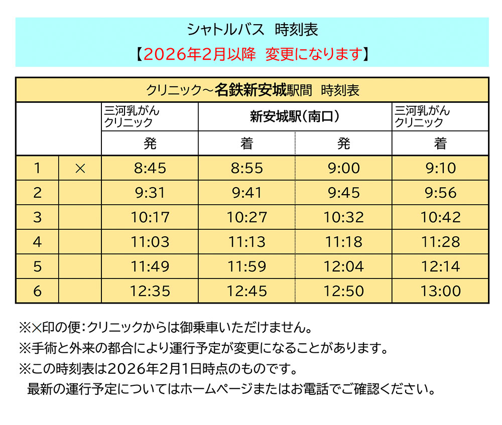三河乳がんクリニックでは、当院と「名鉄新安城駅」および「JR三河安城駅」を結ぶ循環バスを運行しています。